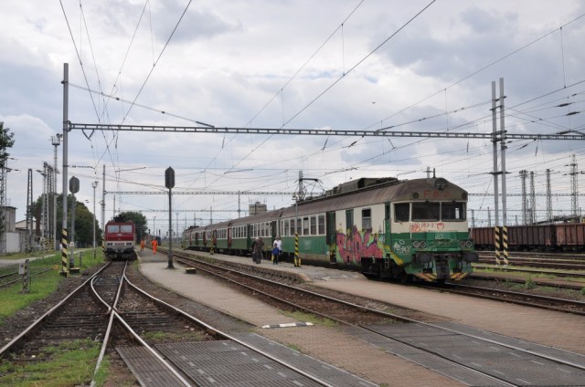 Am vierten Tag sollte es schon in die Ukraine gehen. Um 12:04 Uhr ging es in gut zwei Stunden bis zum letzten slowakischen Ort Čierna nad Tisou nahe der ukrainischen Grenze. Dort schien die Zeit still zu stehen, ein Bahnhof wie er sozialistischer hätte nicht sein können. Bis auf die Einführung des Euro hatte der Bahnhof wohl in den letzten 30 Jahren nicht viel Neues gesehen. Weder ein Fahrplan, noch eine Ansage oder geschweige denn eine profane Bahnsteigbeschilderung wiesen auf meine Weiterfahrt hin. Da aber der letzte Wagen unseres 6-Wagen-Zuges auf das Nachbargleis rangiert und an einen Ein-Wagen-Zug gehängt wurde, wusste ich, dass dies mein Anschlusszug sein muss. Dieser bestand nämlich aus einem Erste-Klasse-Wagen der ehemals tschechoslowakischen Staatsbahn aus den tiefen Achtzigern und einem zusätzlichem blau-gelb lackierten Normalspurwagen der Ukrainischen Staatsbahn. Eine merkwürdige, aber sehr diplomatische Zuggarnitur, wie ich finde.