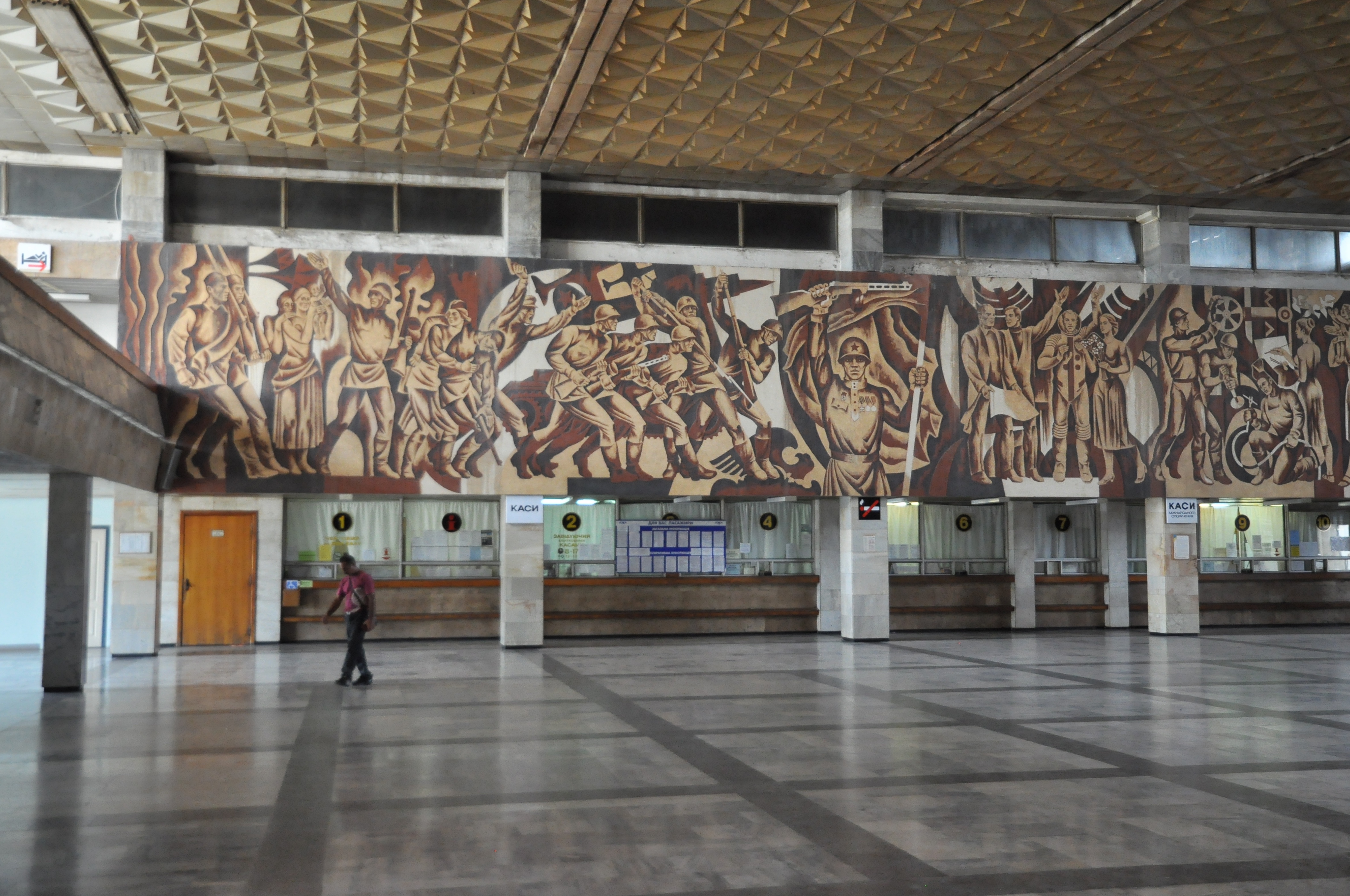 Kam mir der vorige Bahnhof schon altbacken vor, war Chop noch mal um einige Jahrzehnte zurück: eine Bahnhofshalle wie im Bilderbuch – an beiden Wänden befand sich zwischen den Eingängen ein sozialistisches Wandgemälde aus den Achtzigern, das einen lückenlosen Bogen von der Russischen Revolution bis zum Prager Frühling zeigt. Der erste Eindruck der Ukraine ist, voreilig gezogen, etwas rustikal, aber nicht heruntergekommen. Bei diesem ehrfürchtigen Anblick traf ich auf Šimon aus Bratislava, mit dem ich mich lieber auf die Bank an die gepflasterte Hauptstraße vor die Halle setzte. Bis auf ein paar Kneipen, Kiosks und aufdringliche Taxifahrer war dort nicht viel los. Šimon war auch Alleinreisender und wollte mit dem Nachtzug über Kiev nach Wolgograd fahren. Mein Nachtzug ging hingegen schon etwas eher, in Richtung Odessa nach Lemberg. Aus mir unerklärlichen Gründen konnte ich an diesem Tag nur diesen Nachtzug nach Kiev über Lemberg im Internet buchen, auch wenn ich schon Mitternacht in Lemberg ankommen sollte, also nicht wirklich über Nacht fuhr. Bloß gut, denn die frühere Verbindung hätte ich wegen der verspäteten Ankunft aus der Slowakei verpasst.