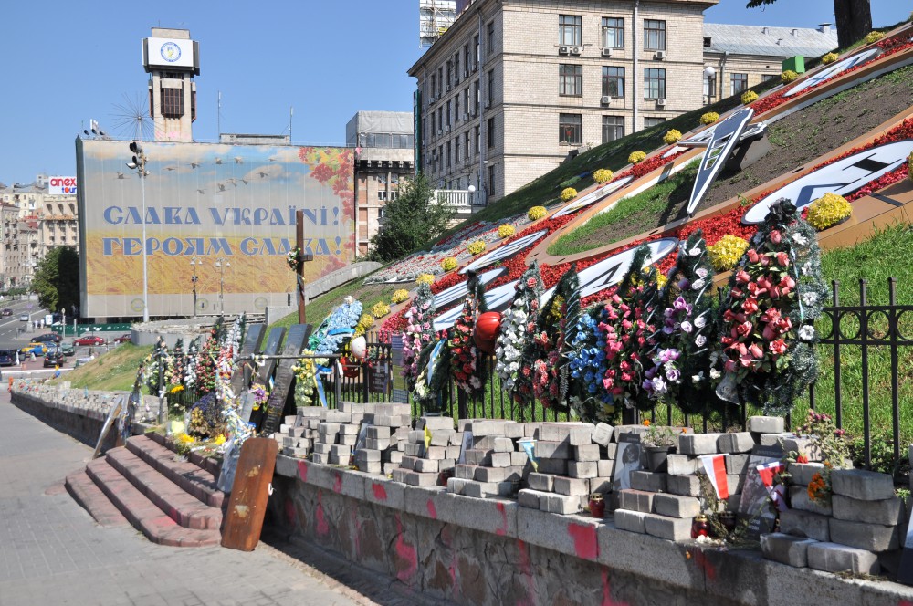 Es ist 5:30 Uhr am Morgen als die Hauptstadt der Ukraine und ich gerade in einem unterschiedlichem Tempo erwachen. Mein Nachtzug war pünktlich in Kyiv Passagieri angekommen. Die Sonne scheint und wird wohl wieder einen heißen Tag bescheren. Ich wollt es langsam angehen, schließlich war es gerade mal sechs Uhr und zu früh, um in ein Hostel einzufallen. Also gab ich meinen Rucksack in einer der non-stop Gepäckaufbewahrungen in dem riesigen Bahnhof ab und setzte mich in eine Schnellimbisskette, um übers Internet die Bleibe für die nächsten zwei Nächte zu buchen. In der schönen, neuen Welt ist das ja wunderbar einfach. Dann hielt mich nichts mehr drinnen, ich war neugierig, wie die ukrainische Hauptstadt tickt.Kiev hat eine Menge zu bieten, wie ich schnell feststellte. Neben zwei ausgedehnten Straßenbahnnetzten links und rechts des Dnepr, erstreckt sich die Stadt kilometerweit auch über das Zentrum hinaus mit prachtvollen Gründerzeitfassaden, herrlichen Parks und Denkmälern. An dem im letzten Jahr wieder bekannt gewordenen Maidan, dem zentralen Platz, kommt man schon aus verkehrlicher Sicht nicht vorbei. Der Platz war vormittags so ruhig, ja fast menschenleer, sodass ich mir gar nicht vorstellen konnte, dass hier vor über einem Jahr eine Revolution begann und mit ihr der Sturz des Expräsidenten Janukowytsch folgte. Daran erinnern nur noch großformatige Collagen und Unmengen an Grabkerzen rings um die riesige Unabhängigkeitssäule. Eindrucksvolle Fotos zeigen Kriegsschauplätze im Donbass, Tote und Ruinen, die unter die Haut gehen. Mitten in Europa – das versetzte mich schlagartig in eine nachdenkliche Stimmung. An einer vom Maidan abgehenden Straße sind unzählige Grabsteine mit Fotos meist junger Soldaten dicht aneinander gereiht. Einige von Ihnen waren mein Alter oder jünger als ich. Ich wundere mich über Soldaten, die mit einer Geldbüchse umherlaufen. Die ukrainische Armee ist nach über einem Jahr Konflikt mir pro-russischen Kräften schlichtweg pleite, wie ich noch später erfahren sollte und versucht, darüber zusätzliche Mittel zu akquirieren.