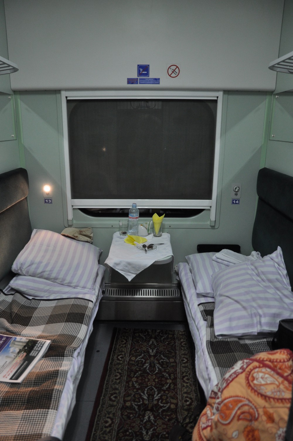 Da ich mir bis fast zuletzt offenhielt, doch noch nach Osten zu fahren, waren bereits sämtliche Liegenwagenplätze nach Odessa der nächsten Tage ausgebucht. So blieb mir nichts anderes übrig, als im doppelt so teuren Schlafwagen erster Klasse zu fahren. C’est la vie, die 20 Euro waren für europäische Verhältnisse auch immer noch erschwinglich und vor allem gut angelegt: das Bett war bereits bezogen, man hatte ausreichend Platz und konnte bequem sitzen, da die oberen Liegen fehlten. Der Nachtzug ging erst abends um 10 Uhr und ging über neun Stunden.