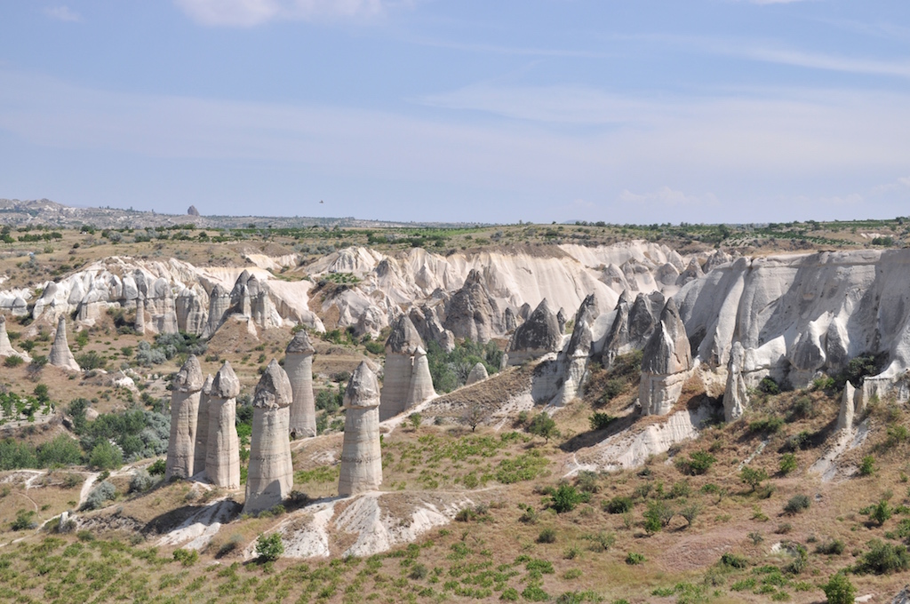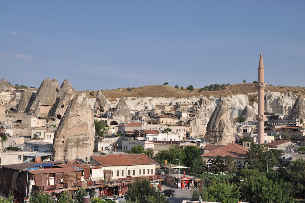 Besonders viel gab es in der Hauptstadt der Türkei ja nicht zu entdecken, also fuhren wir gleich am nächsten Morgen mit dem Güney Ekspresi in modernen Großraumwagen nach Kayseri, das in der Mitte des Landes liegt. Die Schnellfahrstrecke hatten wir längst hinter uns gelassen: für die 380 km benötigten wir sieben Stunden. In Kayseri gab es erst mal einen Notfall zu verarzten, da Martin sich eine üble Entzündung im rechten Auge zugezogen hatte. Während er ins Krankenhaus fuhr, schaute ich mir die Innenstadt an, in der es eigentlich nichts zu sehen gab. Das Zentrum Kayseri erstreckt sich entlang mehrstreifiger Straßen, einer Stadtbahnstrecke und entbehrt einer Fußgängerzone, in der ich hätte warten wollen. Nach nur zwei Stunden kam Martin mit drei Medikamenten erleichtert wieder. Jetzt galt es, den Busbahnhof zu finden, weil wir noch am Abend in Kappadokien ankommen wollten. Gerade noch so konnten wir den netten Teppichhändler auf der Straße dahin abwimmeln, auch wenn er uns auf einen guten Tee bei sich im Basar eingeladen hätte. Aber wir hatten es eilig, zum Bus zu kommen, bevor der Sandsturm in ein Gewitter umschlagen sollte. Einer der unzähligen Stadtbusse brachte uns irgendwie zum zehn Kilometer entfernten Fernbusterminal, Türken platzieren ihre Busbahnhöfe gern außerhalb der Stadt. Nach einer weiteren Busfahrt kamen wir schließlich in Göreme, einem der Zentren Kappadokiens an. Kappadokien ist eine aus Vulkangestein erodierte Landschaft, in der Bewohner in vergangenen Zeiten eine Höhlenarchitektur in das weiche Tuffgestein gebildet haben, die bis heute bewohnt ist. Auch unser Cave Hostel war in einen Felshang geschlagen. Das dunkle Mehrbettzimmer hatte keine Fenster und roch entsprechend streng, war dafür aber kühl und für ein Hostel sehr stilvoll eingerichtet. Nach diesem langen Tag ließen wir es uns bei einem Glas Hauswein und drei jungen Mietzen auf der Terrasse über den Dächern Göremes gut gehen.