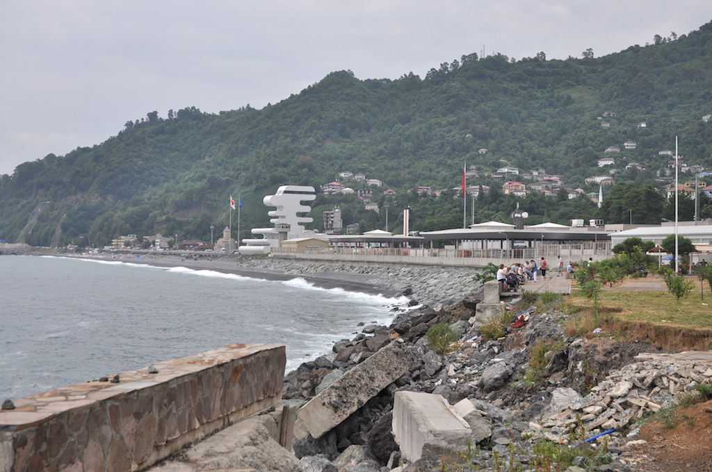 Am nächsten Morgen befolgte ich den Rat des Schaffners und fuhr zum Fernbusterminal, das sich mal wieder ewig weit außerhalb der Stadt befand. Eine Direktverbindung nach Georgien gab es nicht, so musste ich die Fahrt stückeln. Ein Reisebus brachte mich für 20 Euro in fünf Stunden in das 2000 m tiefer gelegene Hopa ans Schwarze Meer. Dort wartete ich die Abfahrt des Minibusses bis zur georgischen Grenze ab, der erst abfuhr, bis er auch wirklich voll war. Den Grenzübergang und die Kontrollen konnte ich in einer Stunde zu Fuß durchlaufen. Hinter der Grenze standen bereits georgische Marschrutki in das gerade mal 20 km entfernte Batumi zur Abfahrt bereit, wo ich planmäßig am Nachmittag am Busbahnhof ankam. Der erste Eindruck Georgiens war wie erwartet etwas morbide, auch der Straßenverkehr lief mir sehr russisch ab. Wieder erlitt ich einen Kulturschock, ist Georgien doch ganz anders als die gerade lieb gewonnene türkische Kultur.