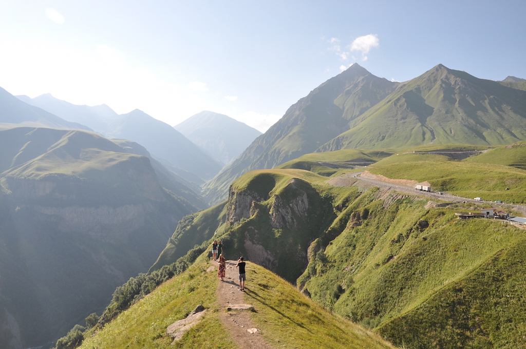 Das quirlige Hauptstadtleben war für uns völlig fremd. Touristen und ein belebtes Zentrum mit verkehrsberuhigten (!) Straßen gab es seit Istanbul nicht mehr. Dennoch kam mir die kaukasische Metropole mit über einer Millionen Bewohnern tagsüber gefühlt kleiner vor. Man stelle fest und wende folgenden Schlüssel an: verglichen mit anderen europäischen Städten beträgt die gefühlte Größe einer georgischen Stadt etwa einem Viertel ihrer Einwohnerzahl. Abgesehen von den nicht identifizierbaren georgischen Schriftzeichen, bestehend aus Eistüten und Schlangen, kam mir die das Verhalten der Menschen auf der Straße sehr russisch, zurückhaltend und distanziert vor. Am Abend landeten wir in einer der modernen Flaniermeilen des überschaubaren Zentrums und zelebrierten die neue gewonnene Zivilisation bei Livemusik und einer Hopfenkaltschale. Die nächtliche Szene war international und gut besucht, wir kamen uns in Anbetracht der zahlreichen herausgeputzten Schönheiten etwas unterrepräsentiert vor. Halb so wild, wollten wir doch den nächsten Tag früh mit einen Ausflug in den Kaukasus beginnen: mit der Marschrutka ging es in drei Stunden die georgische Heerstraße, die Georgien mit Russland verbindet, auf zwischenzeitlich 2500 m hinauf in den Ort Stepanzminda, das sich schon nahe der russischen Grenze befindet. Dort erklommen wir die Wallfahrtskirche Zminda Sameba aus dem 14. Jahrhundert auf unwegsamen Gelände. Wir hatten Glück, da die Sicht auf das Tal und den 2000 m höher gelegenen Berg Kasbek gut war. Nach der griechischen Mythologie wurde Prometheus an diesen Berg gekettet, da er den Göttern das Licht gestohlen hatte. Ein Adler riss ihm täglich die immer nachwachsende Leber aus dem Leib.